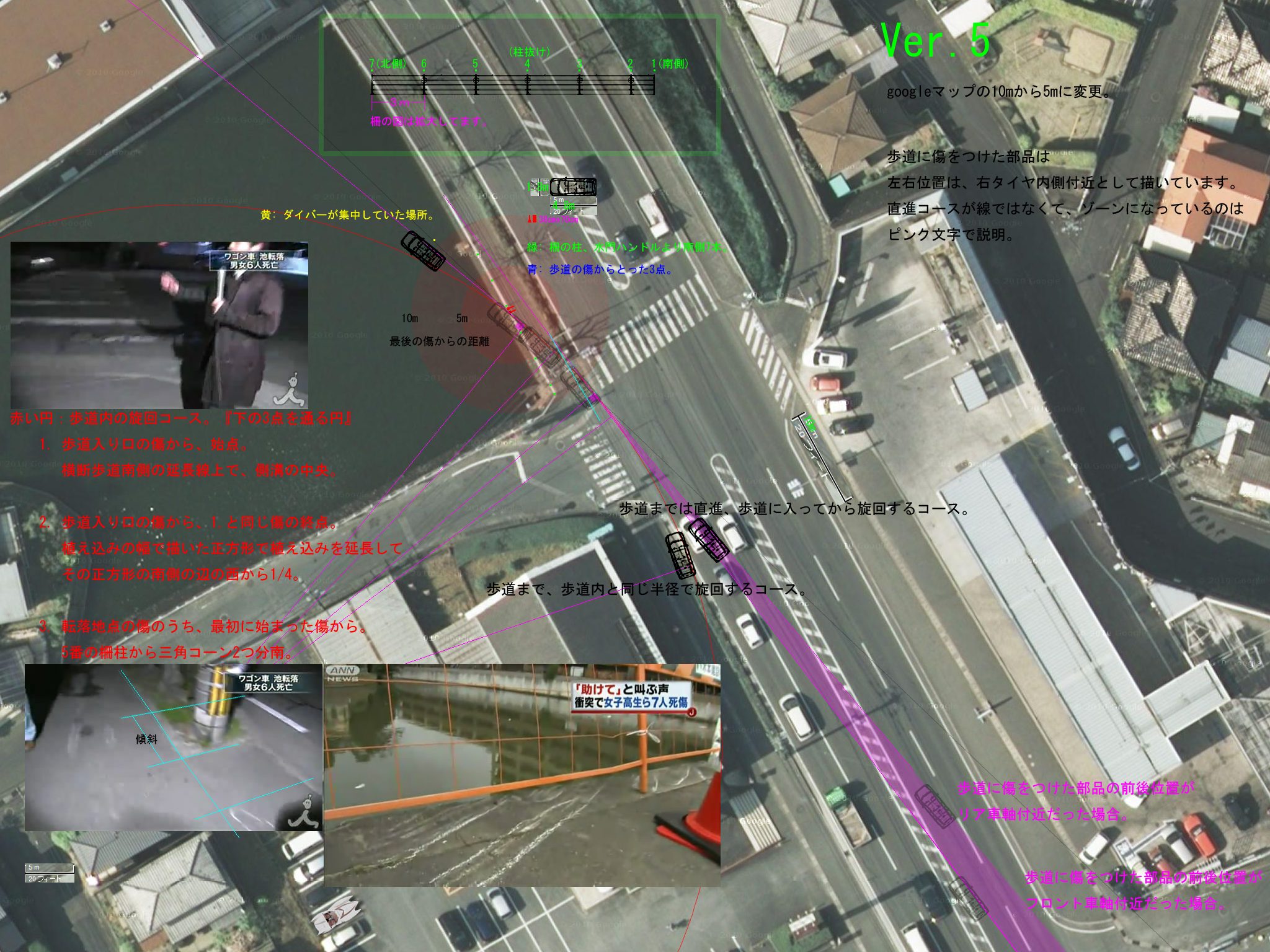このラインの他にも交差店内で接触して、歩道に乗り上げてから急ハンドルを切って曲がった可能性も無くは無いですが、相当にスピードが出ている場合はハン ドルを切っても曲がりませんからね。スピードが出ていなければ、そもそも防護柵を破壊する事は無かったでしょうし落ちる前に停止出来たと思います。